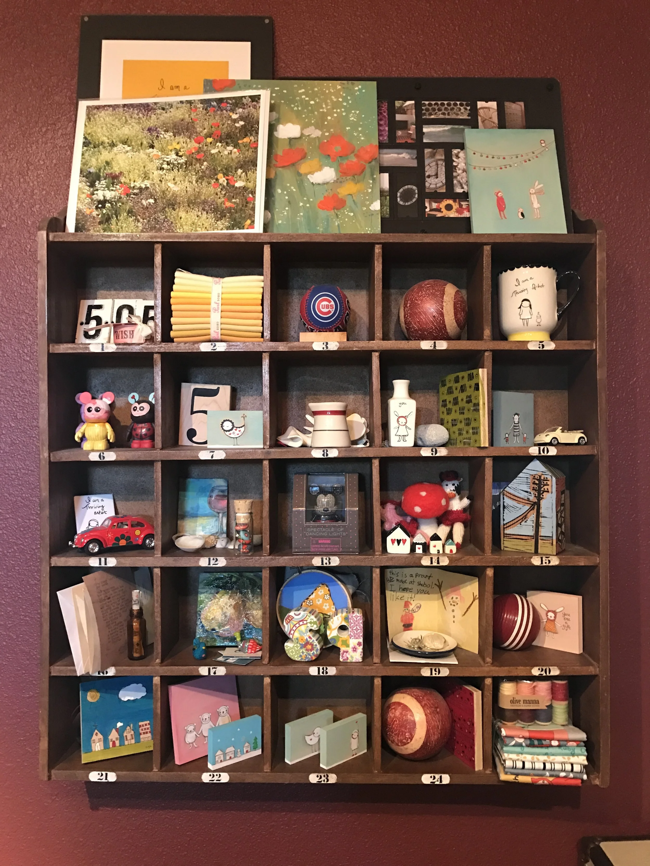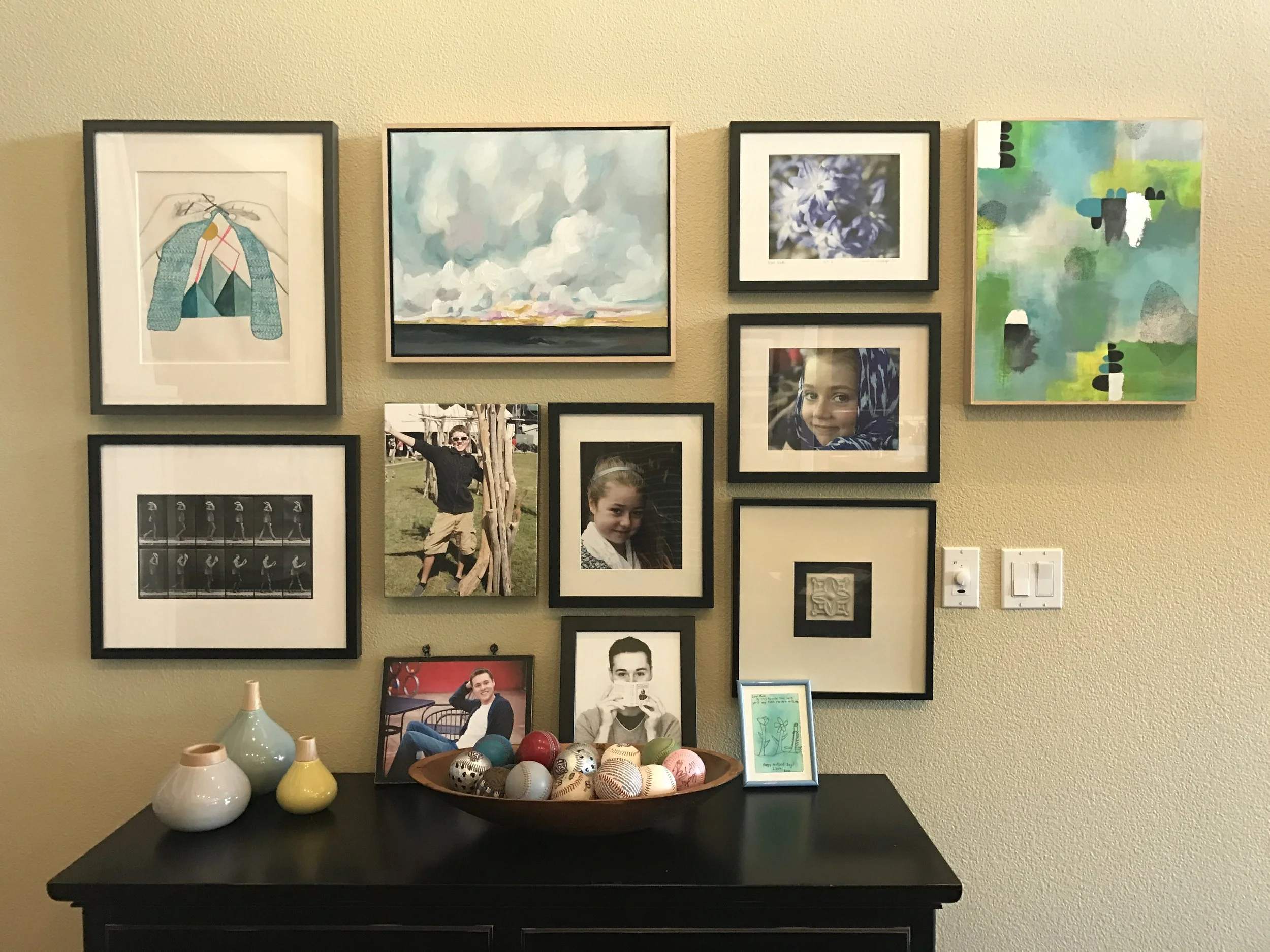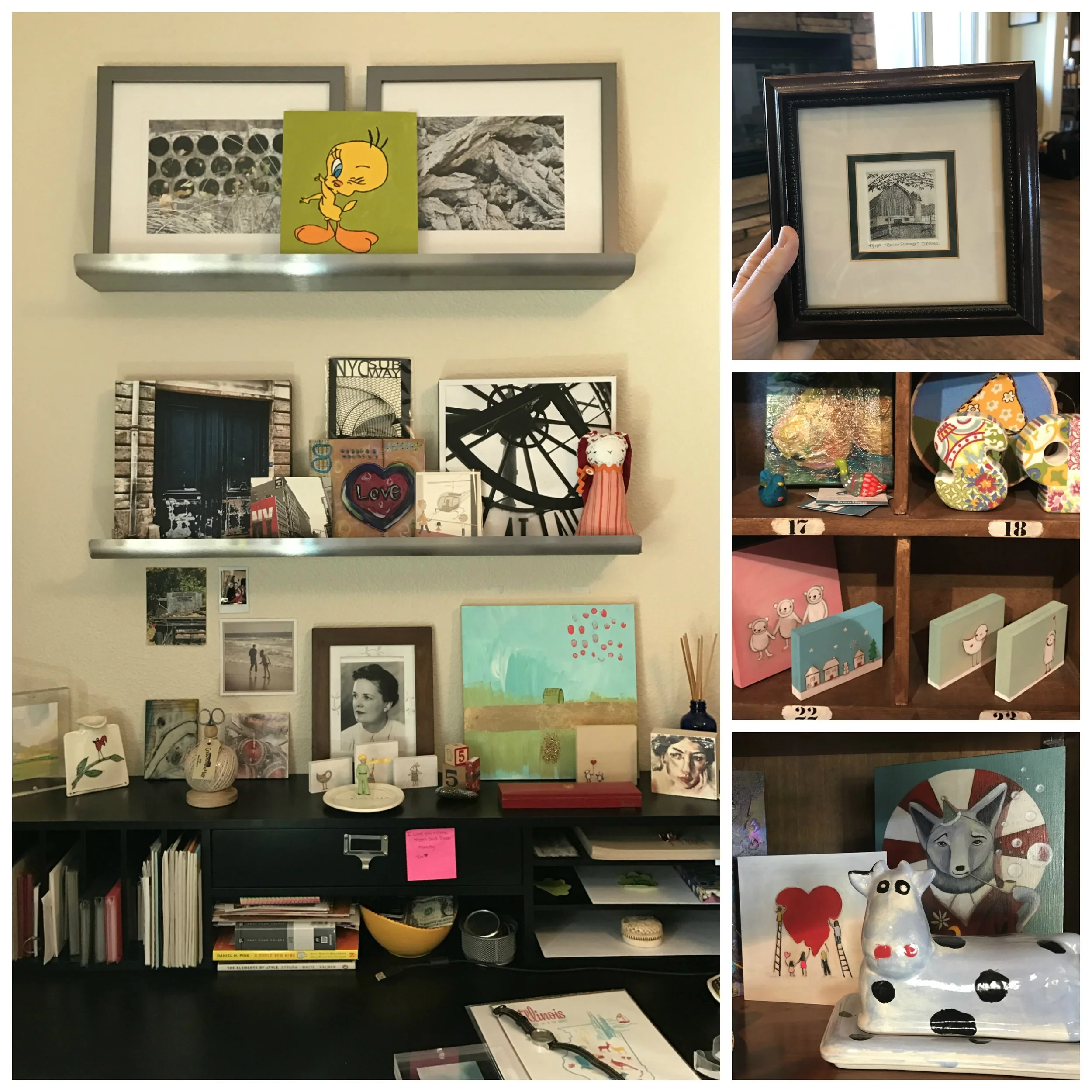 In Chicago, Sarah was an interior designer and it is this background that she now brings into her home for the placement of her collection. Sarah displays some art in a typical eclectic arrangement in her living room, but also sprinkles it around the house in built-in bookshelves, on picture ledges, and - most notably - tucked inside letterbox-style cubbies. The cubbies stand out as a dramatic tribute to the act of collecting. Tiny miniature paintings are intermixed with vintage red balls, a Cubs ball, vintage toys, and stacks of colorful fabric. Many of the collections around the house include her own photography and the art of her children as well. This whimsical and eclectic approach gives the whole house a loving sense of family.