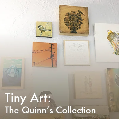 Years ago when I first visited my friend Evan in New Hampshire (before we both moved to the west coast) I spent a good, long time kneeling on her couch and staring at her tiny art collection. At that time, Evan and her husband lived near the lovely Nahcotta Gallery, which is known for it’s annual Enormous Tiny Art Show (which just happens to have opened Friday!), which is now also an always-available online store. Nahcotta’s show made it easy for the Quinns to start collecting, which they did on a regular basis as part of their date nights to local art walk events. By the time I first saw their collection, it was already lovely and intriguing.