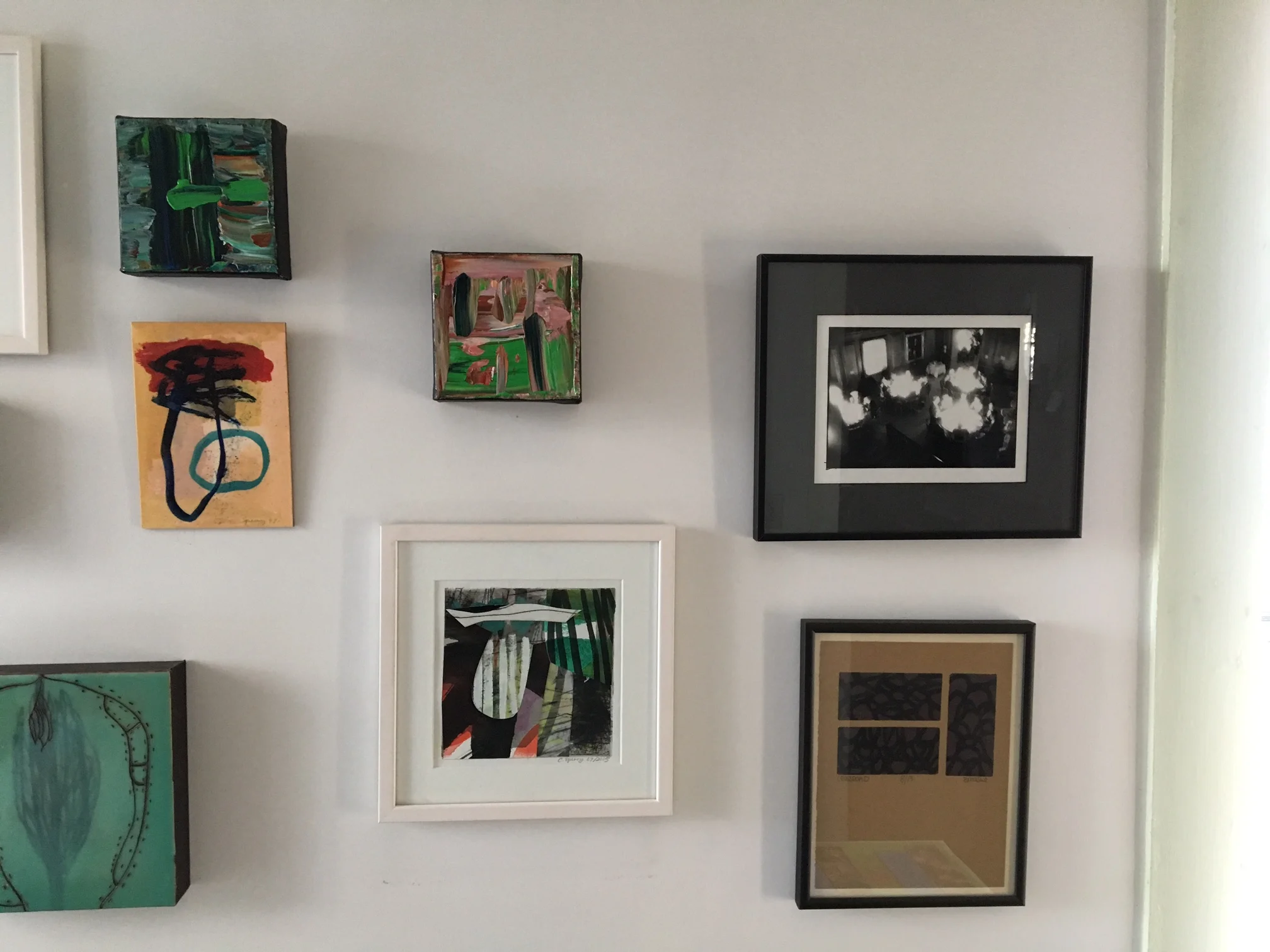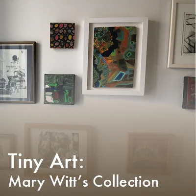 Mary started collecting tiny art several years back when her mom began a collection. Buying tiny work allows her to have bits and pieces of work by many artists, especially the ones whose bigger work is out of her price range. A family of tiny art hangs on her office wall where she can see it as she works. Mary arranges them organically but also aims to intersperse the colorful and monochromatic to balance the arrangement.