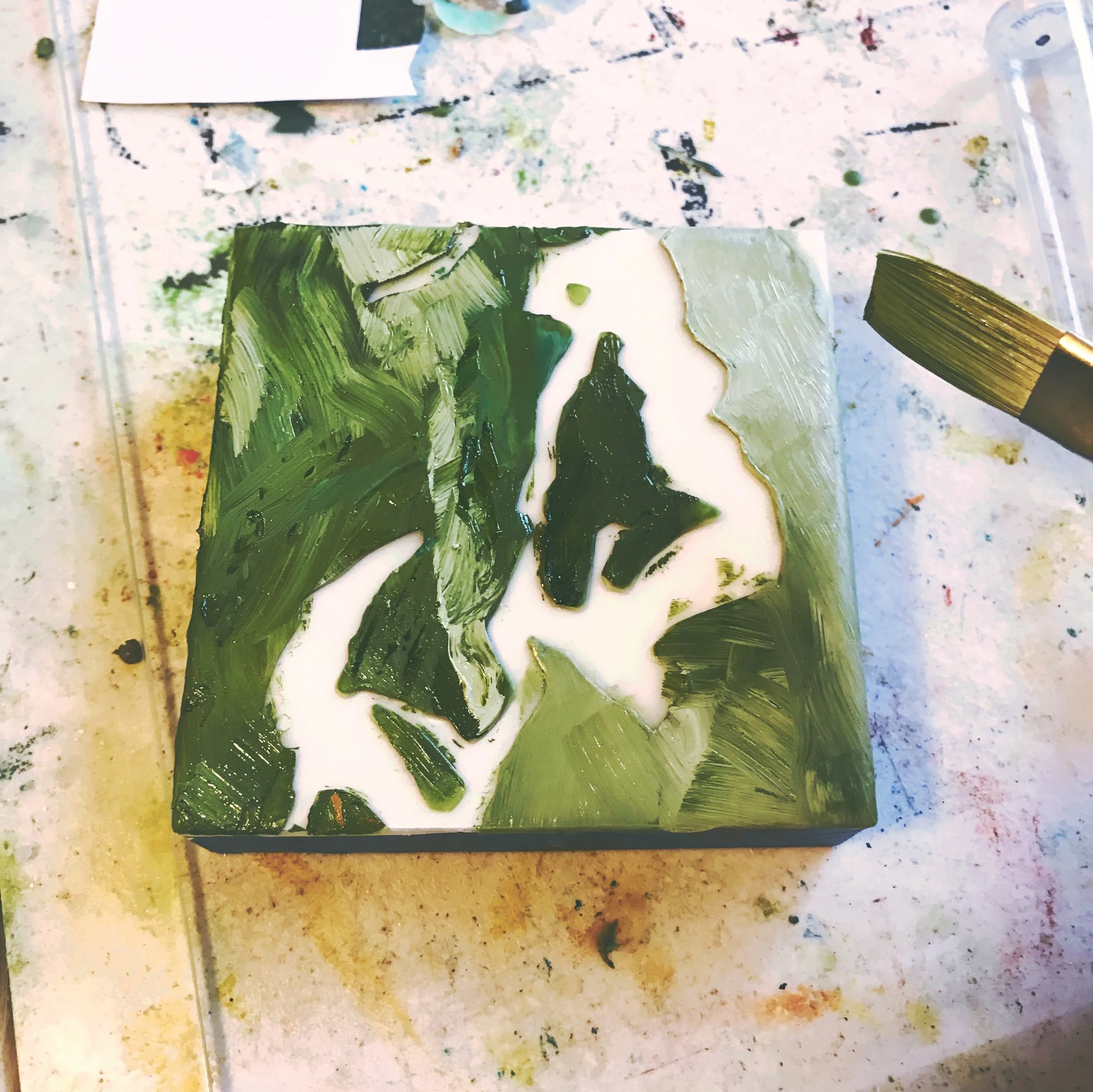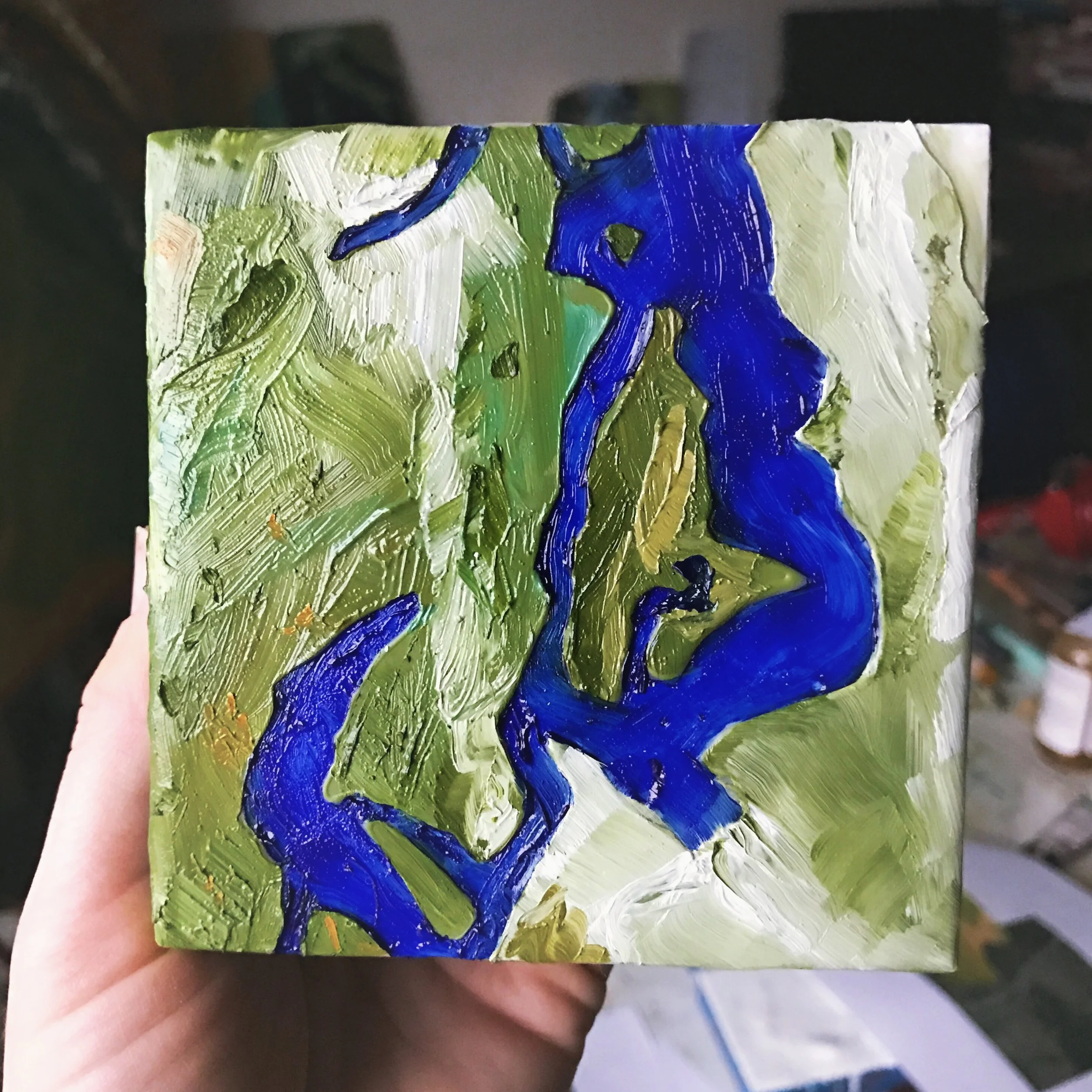 Fast forward to this year, Evan and Randy collect tiny art (featured here) and commissioned a tiny piece of their new home in the context of the Puget Sound. Tacoma is the port city in the lower right corner, Seattle is peeking down from the upper right, and the lovely Olympic Peninsula begins off to the left. Evan wanted the painting to encompass the whole area because, for them, living in Tacoma isn't about the neighborhood they chose, it's about the whole beautiful setting.