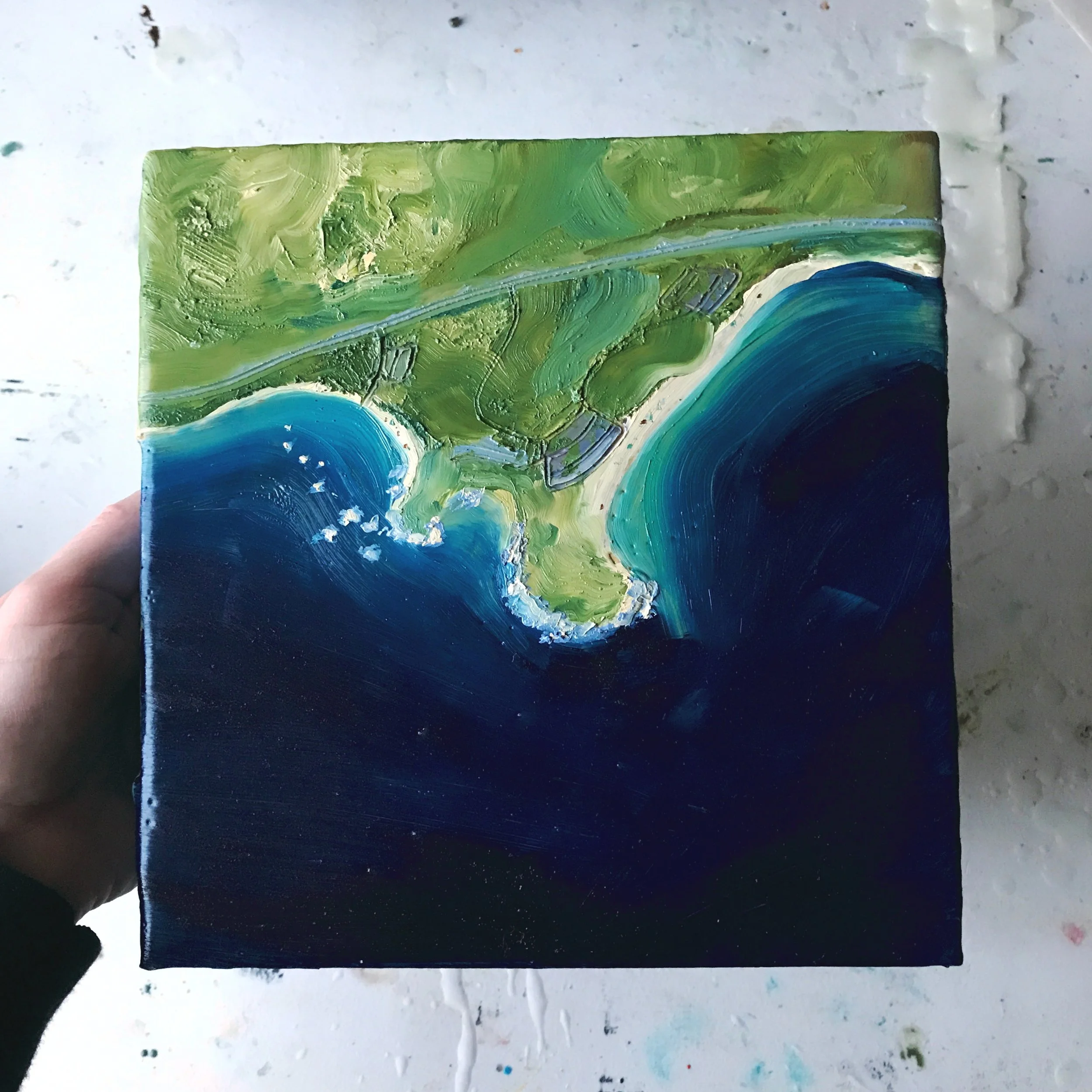 Sand Harbor lies on the eastern shore of Lake Tahoe. It is my favorite beach on the lake, so it was fun to paint this as a commission for someone who loves it as well. Sand Harbor is a place that captures the magic of summer. Rocks jut out of the crystal clear water and create a landscape unto itself – part land, part water. There is ice cream nearby, the smell of sunscreen, and a long beach stretching invitingly. Home away from home.